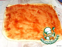 Испечённый бисквит кладём на полотенце и верх смазываем мармеладом |
