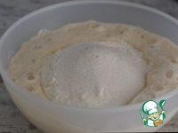 Всыпать в подошедшую опару оставшийся сахар, просеянную и смешанную с солью муку (450 г) и ванилин. Соединить ингредиенты лопаткой. |