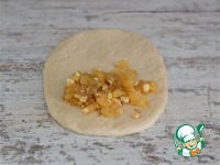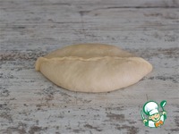 Раскатать каждую заготовку в овальный пласт. Выложить в середину неполную столовую ложку начинки. |