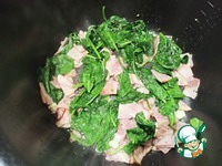 Добавляем в чашу шпинат и половину ложки приправы «Итальянские травы» — Режим «Жарка» 4 минуты. |