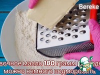 В муку добавляем разрыхлитель и далее натираем на крупной терке сливочное масло время от времени макая масло в муку. Затем делаем с нее крошку. |