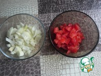 Пока лук жарится, берем нарезанный помидор и просто отжимаем в руке. Нам не нужна лишняя влага. Добавляем помидор в сковороду. |