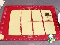 Тесто делим на 4 части. Каждую часть раскатываем в пласт размером ~ 20*30 см. Обрезаем края, разрезаем на 8 сегментов. Делаем надрезы, укладываем начинку и формируем цветочек. |