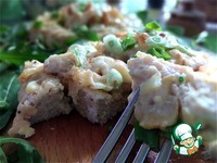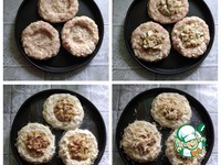 Фарш визуально делим на 3 части. Берём подходящую антипригарную форму или силиконовый коврик, или противень, застеленный пекарской бумагой. Выкладываем ложкой фарш и формируем его округлой формы, толщиной примерно 2 см. Берём стакан, обмазываем дно его маслом и проделываем углубления, как для ватрушек. Начинку грибную тоже визуально делим на 3 части и помещаем в фарш в углубления. Ставим в разогретую духовку до т-180 С, выставив время 30 минут. За 5 минут до окончания время приготовления, вынимаем форму и присыпаем "ватрушки" натёртым сыром. Сыр не принципиально какой, важно, чтобы он был качественным и хорошо плавился, а не твердел. |