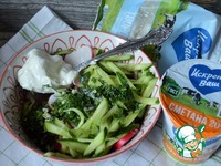 Редис нарезать колясками, огурец крупной соломкой. P.S.: Когда то узнала, что огурцы и редис в салаты надо нарезать по разному, это не даст им слипаться. |
