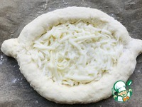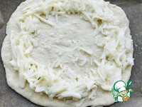 Расправляю лепешку на противне и выкладываю часть начинки по краям. |