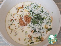Затем влить сливки, добавить остальной зелёный лук, базилик, зернистую горчицу и соль (1/2 ч. л.). |