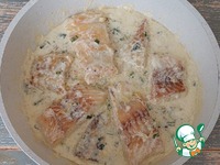 Обжариваем кусочки на оливковом масле (2 ст. л.) до золотистости с двух сторон. Перекладываем рыбку на тарелку, накрываем фольгой. |