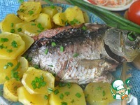 Нафаршировать рыбу, выложить на смазанный маслом противень. Вокруг выложить картофель. |