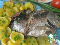 Описание: В теплом и уютном доме всегда пахнет домашней едой. Попробуйте порадовать своих близких - приготовив такую фаршированную, ароматную рыбку. Рыба фаршированная гречкой с квашеной капустой, по краям запечённый картофель. Никого не оставит равнодушным.