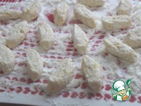 Нарезаем кусочки и выкладываем их на муку. На тесто просто надавливаем ножом. |