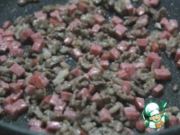 В кипящей воде отвариваем вареники. Выкладываем в тарелку, на дно которой кладем немного сливочного масла (или, много)). На сильном огне, помешивая, обжариваем бекон и колбасу. |