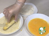 Каждый ломтик баклажана сначала обваляем в муке, затем в яйце и в конце в панировочных сухарях. Подготовим так все баклажаны. |