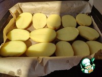 Количество картофеля примерное, берите то, которое уместится на вашем противне. Картофель тщательно вымыть, разрезать пополам и выложить на противень, застеленный пергаментом. У меня противень 20×30. |