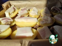 Сало тоже берём то количество, которого хватит на картошку. Кусочки должны быть крупными и не тонкими, около сантиметра в толщину. |