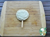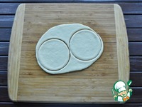 Тесто делю на пять частей, выкладываю на доску и накрываю пленкой, чтобы не подсохло. Каждую часть теста раскатываю в пласт, толщиной 5 мм и вырезаю формой два круга. |