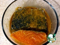 2. Маринуем рыбу в соевом соусе с горчицей, имбирем, уксусом и чесноком, натертом на мелкой терке. Оставить рыбу в маринаде как минимум на час (можно и на ночь в холодильнике).