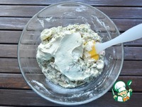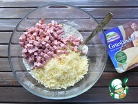 Колбасу нарезаю кубиком. Сыр натираю на мелкой терке. Соединяю с сухими компонентами теста и перемешиваю. |