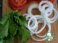 Сделать заготовки для верха бургера. Выложить лист салата, помидор и лук. |