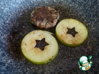 Сформировать круглую котлетку по размеру булочки и пожарить на сковороде. Яблоко нарезать на кругляшки, вырезать сердцевину и тоже слегка обжарить. |