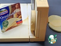 Сыр нарезать тонкими ломтиками. Я нарезала на электроломтерезке. |