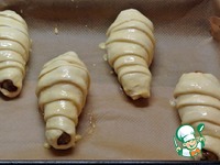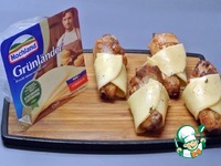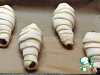 Каждую куриную голень с сыром обернуть длинной полоской слоеного теста, располагая витки полосок внахлест. Начинать надо с косточки, при этом тесто необходимо слегка растягивать. |