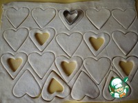 Слоёное тесто немного раскатать. Вырубкой в виде сердечка вырежьте заготовки любого размера. |