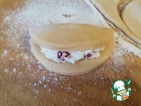 На каждый кружок кладём столовую ложку начинки и складываем пополам. |