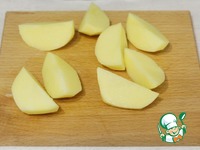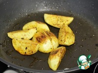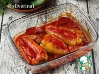 Нафаршировать перец начинкой, а в надрезы вставить ломтики помидоров. Выложить перец в глубокую форму для запекания. Рядом выложить картофельные ломтики. |