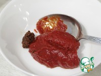 Приготовить соус. В глубокую миску положить томатную пасту, добавить аджику, соль, перец. |