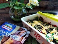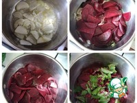 На сковороду выкладываем кусок сливочного масла, растапливаем его и кладём репчатый лук, порезанный полу-кольцами. Лук томим на минимальном огне под крышкой до мягкости. Выкладываем к нему свёклу, порезанную тонкими полу-пластинами. Томим минуты 3 и наливаем сухое вино. Готовим до выпаривания алкоголя. Солим и перчим по вкусу. Добавляем порванный мангольд. Готовим ещё с минуту и снимаем с огня. Если у вас будет молодая свёкла, то её нужно порезать тоже тонкими полу-пластинами и томить в масле и вине до готовности, а это минут 15 примерно. |