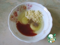 В миску разбить яйца, добавить сыр, кетчуп с водой, соль и перец. |