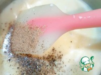 Влейте молоко. Добавьте черный свежемолотый перец и мускатный орех. Прогрейте массу до загустения. |
