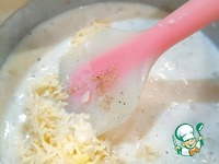 Затем натёртый сыр. Хорошо перемешайте. Снимите с огня. Дайте соусу слегка остыть. |