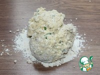 8. Затем выкладываем тесто на подпыленную мукой столешницу и вмешиваем остатки муки, собираем тесто в ком. |