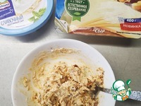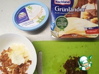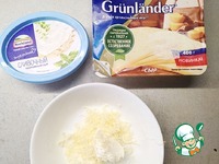 Смешать два вида сыра: творожный и мелконатертый твердый сыр. |