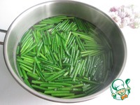 Для удаления горечи стрелки поместить в кастрюлю и залить кипящей водой на 2 минуты. Потом откинуть на дуршлаг и обдать холодной водой. Дать стечь воде. |