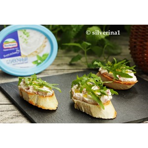 Намазать дип на подсушенные кусочки багета. |