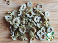 Оливки нарезать кольцами или полукольцами. |