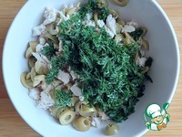 Соединить в миске куриное филе, оливки и, мелко нарезанный, укроп. |
