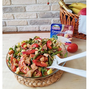 Описание: Салат на пикнике всегда едят с удовольствием. Но вот приготовить его заранее и довезти на природу, сохранив его свойства, это проблематично. Предлагаю приготовить итальянский хлебный салат Панзанеллу. Не классическую, а Панзанеллу кроканте (хрустящую). Это салат из вчерашнего хлеба с овощами. Его фишка как раз и состоит в том, что он должен настояться. Овощные соки смешиваются и впитываются кусочками подсушенного хлеба. А сочетание хлеба, сыра и помидоров с оливковым маслом, дополненное хрустящими кабачками и фасолью, да плюс еще кедровые орешки... Это не описать словами. Это нужно приготовить и попробовать! На пикнике или дома. С компанией или с собой любимой. Не важно. Важно познакомиться с этим салатом и полюбить его всей душой, как люблю его я. Уже давненько.