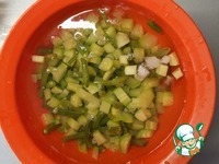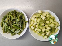 Фасоли и кабачка должно быть примерно одинаково по количеству. Бланшировать овощи в кипящей подсоленной воде около 2-х минут. |
