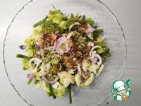 Начинаем собирать салат. Смешать лук, кабачки, фасоль, заправить бальзамическим уксусом и оливковым маслом. |