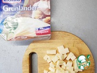 Сыр нарезаем кубиками. Сыр Грюнландер идеально подходит для этого салата и по вкусу, и по своей структуре. |