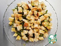 Это очень практичный салат. Собираем остатки вчерашнего хлеба, режем на кубики и слегка подсушиваем в духовке. Не до сухарей. До хрустящих бочков. |