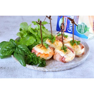 Обернуть каждую половинку яйца ломтиком бекона, сверху положить по ломтику сыра, присыпать кайенским перцем, конструкцию закрепить шпажкой. Запечь в духовке или на гриле в течении 7 минут. |
