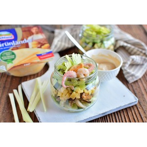 Для салата с собой - в порционные баночки выложить шпинат, на него резанный небольшими кубиками - сельдерей. |