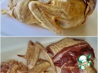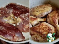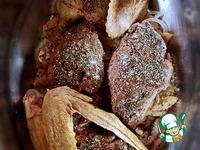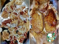 Вот так, равномерно утиные части, присыпав, я сверху еще и крылья положил. Для навару вредным не будет. |