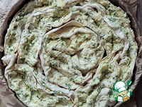 Форму для выпечки застелить бумагой для выпечки и смазать растительным маслом. Разложить по кругу слоеные гармошки. |