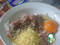 В мясной фарш добавьте мелко нарезанный лук, тертый сыр, куриное яйцо, посолите по вкусу |